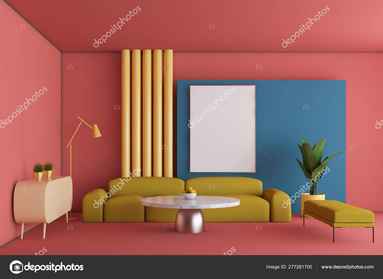 Pink And Blue Living Room Interior With Poster Stock Photo Blue Living Room Yellow Sofa